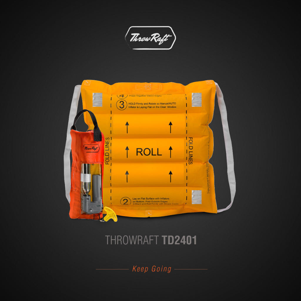 The safety device we hope you never have to use. 5X smaller than the square cushion and 9X smaller than the ring buoy, the ThrowRaft Original (TD2401) and ThrowRaft Search and Rescue Yellow (TD2401) meet carriage requirements and legally replace other throwable Type IV devices on recreational vessels.